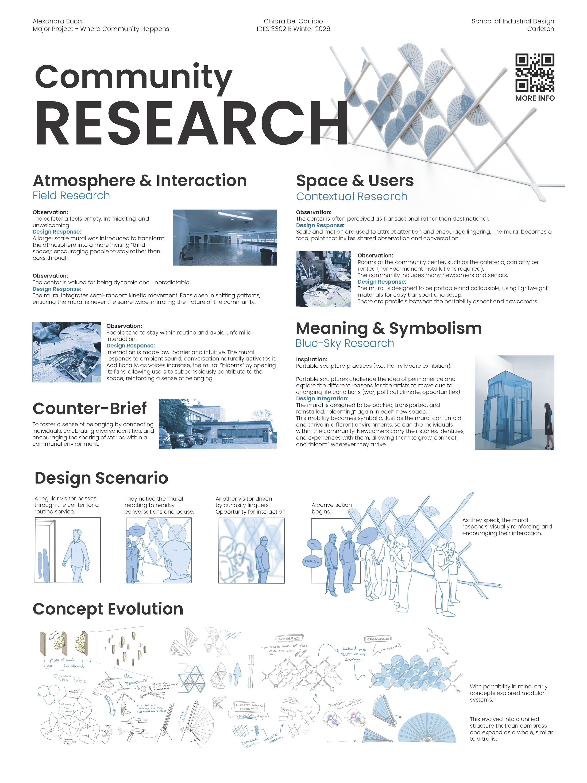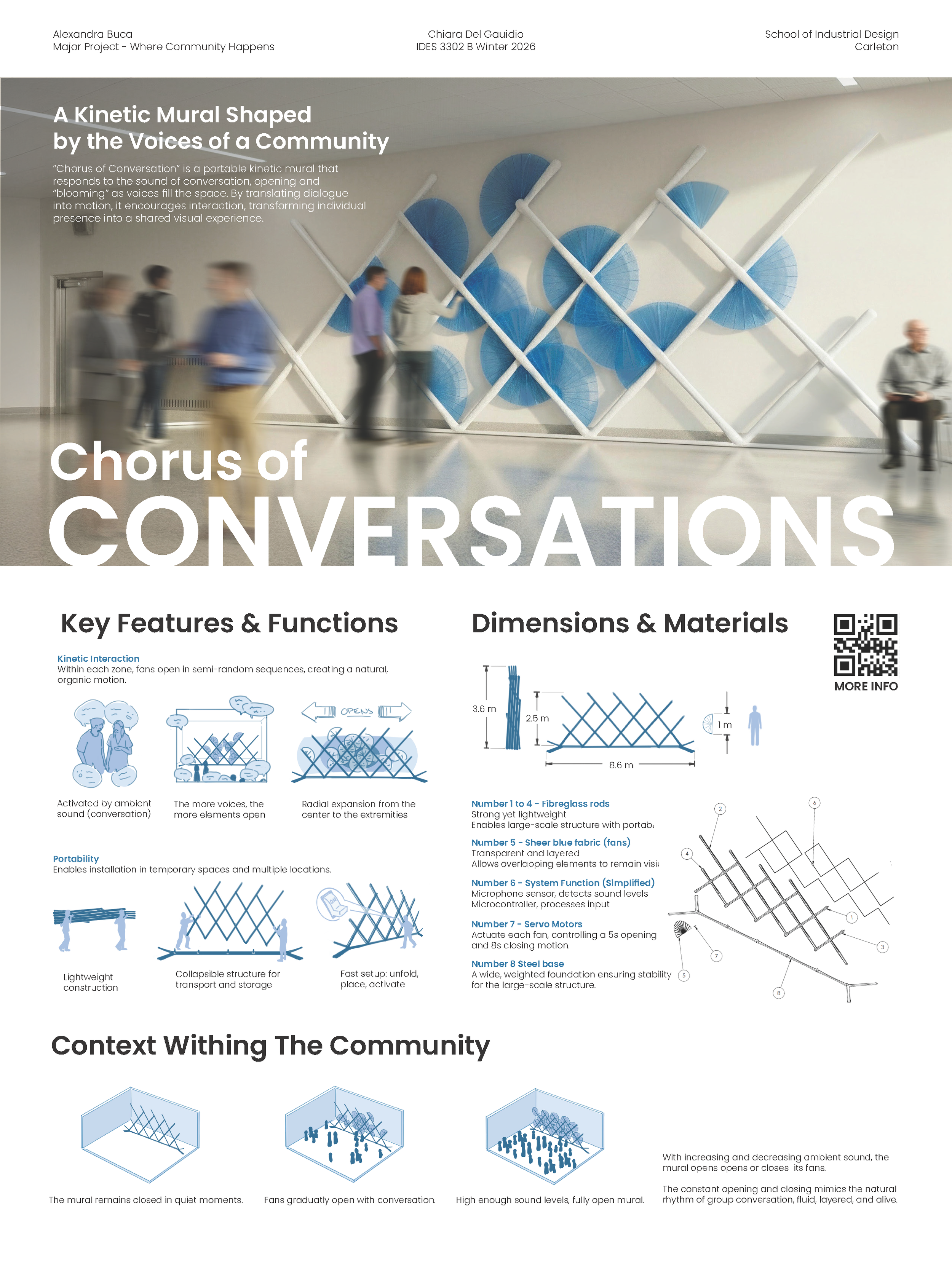 A portable kinetic mural that responds to the sound of conversation, opening and “blooming” as voices fill the space. By transforming dialogue into motion, it encourages exchange between individuals, fostering connection as a gateway to community.