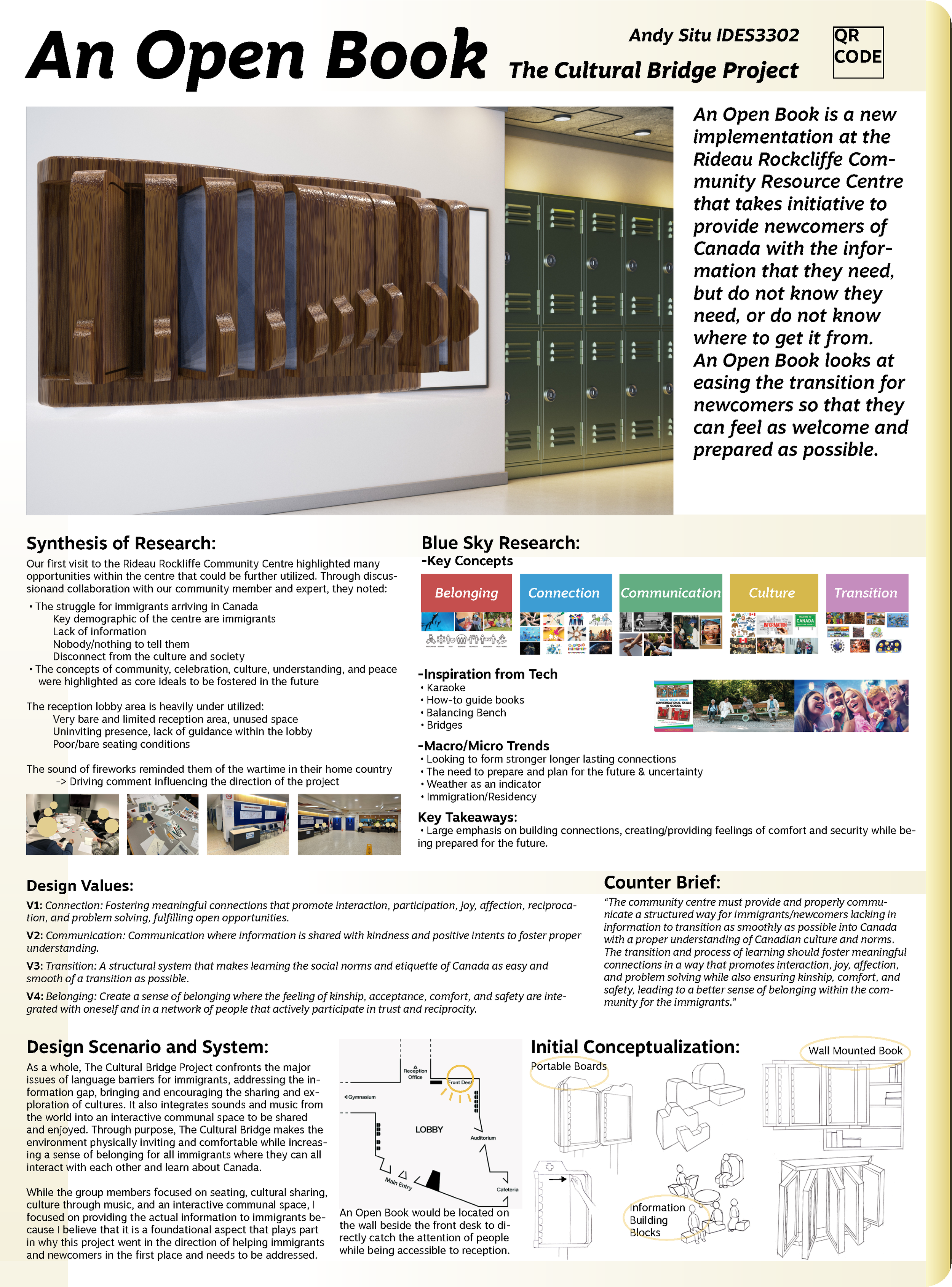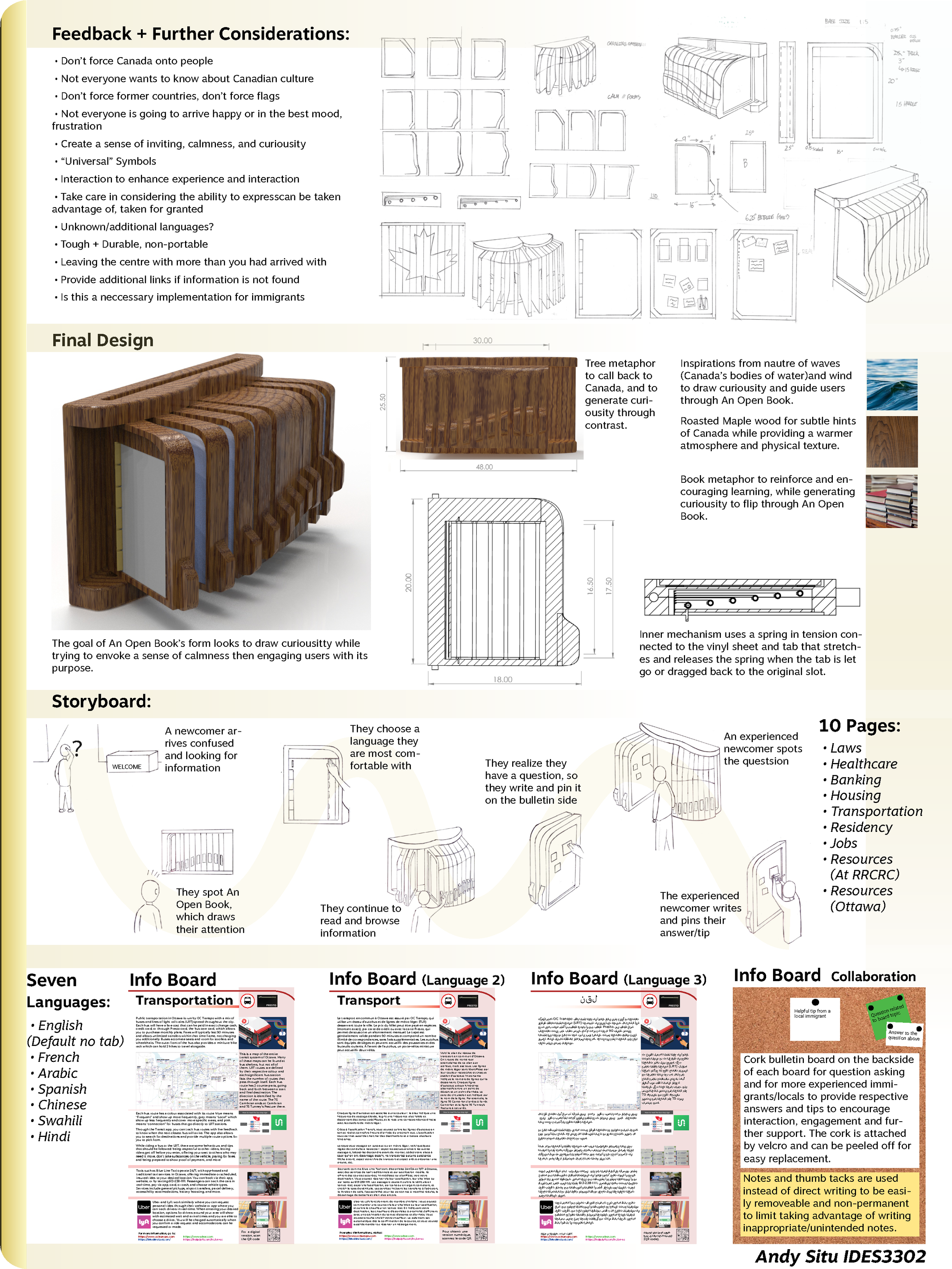 An Open Book is a wall mounted book that helps ease the transition into Canadian culture/life for immigrants by providing important information in different languages while providing opportunities to share between immigrants and locals.