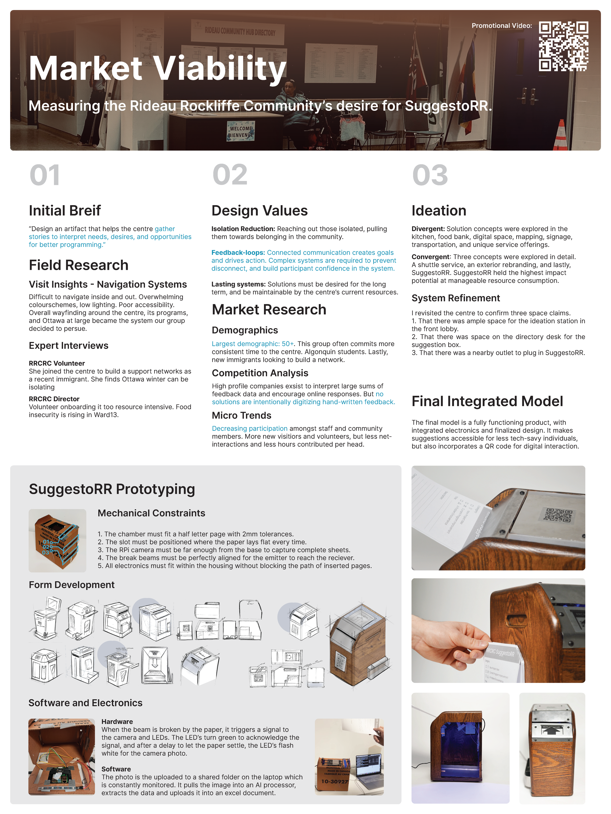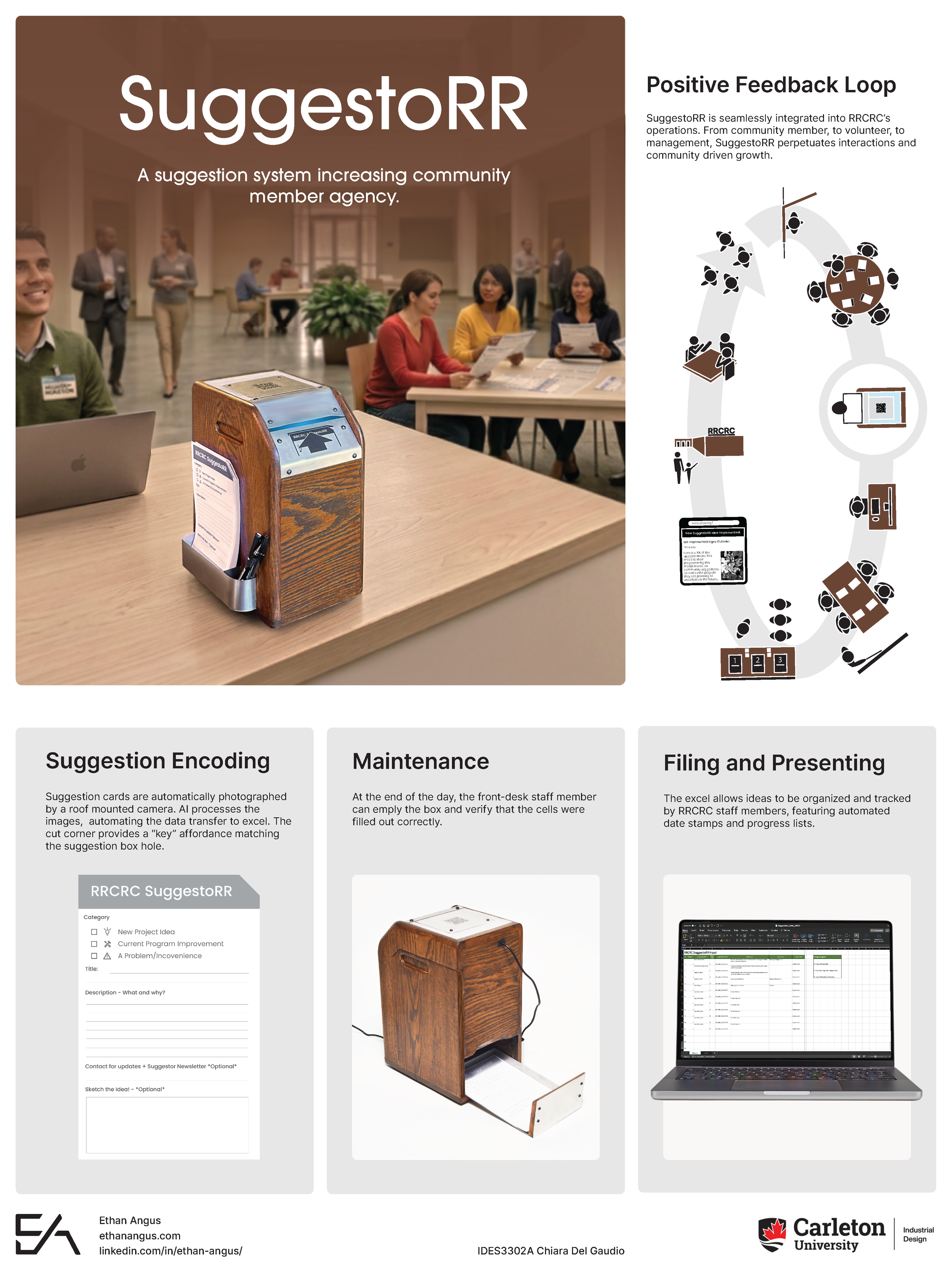A radical innovation of the suggestion-box, digitizing handwritten suggestions using AI imaging. The service features an ideation station, and a closed feedback loop allowing communication from new community members up to upper management. SuggestoRR bolster’s community agency, and in turn interaction.