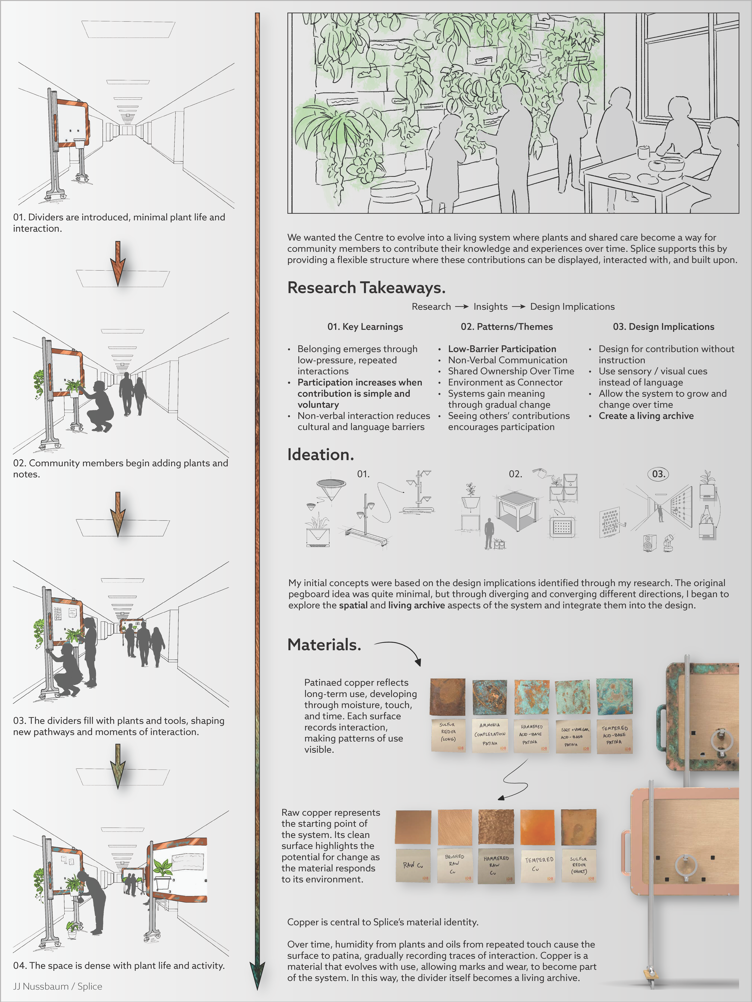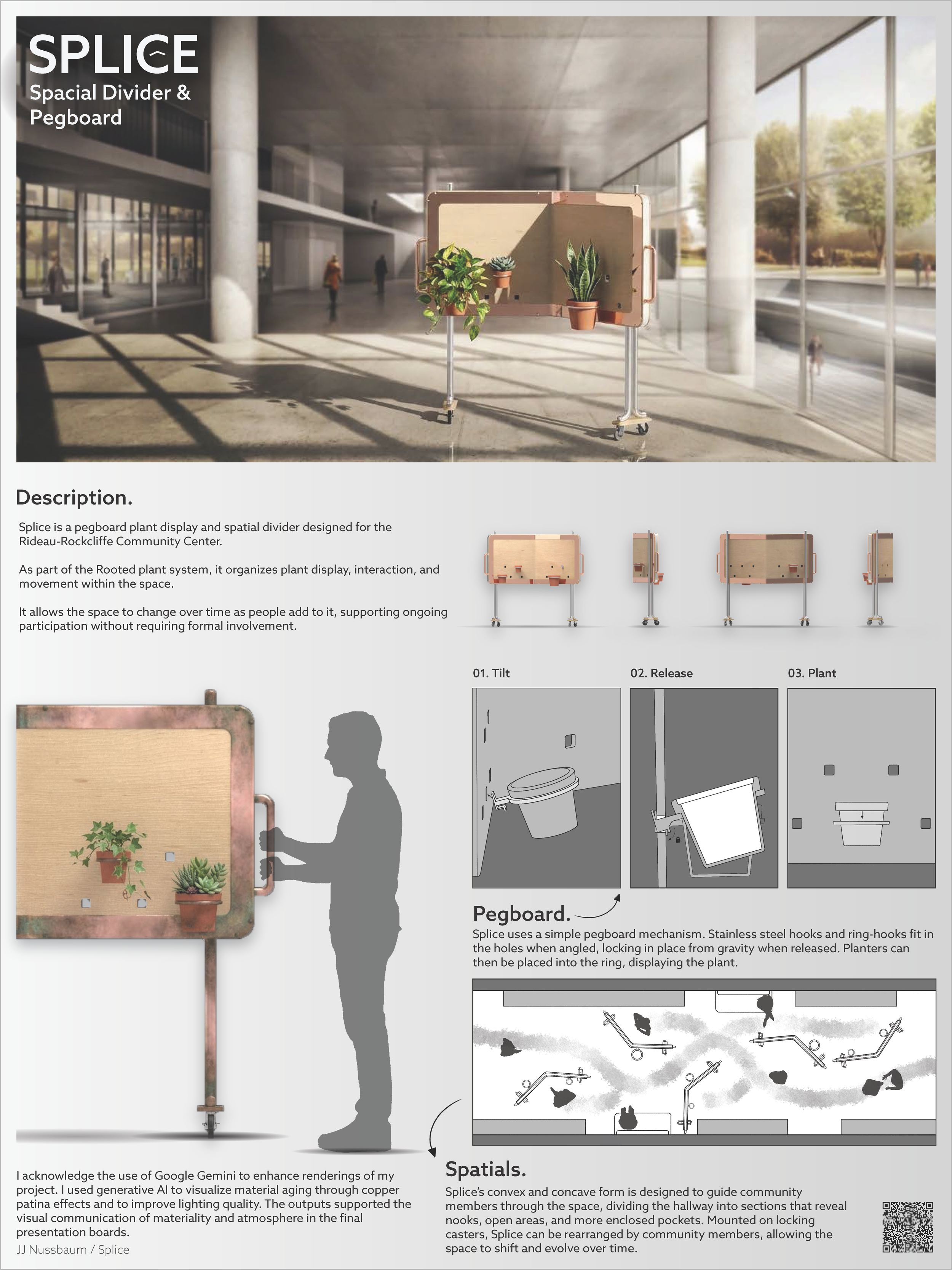 Splice is a movable pegboard plant display and spatial divider that allows community members to contribute, display, and care for plants.