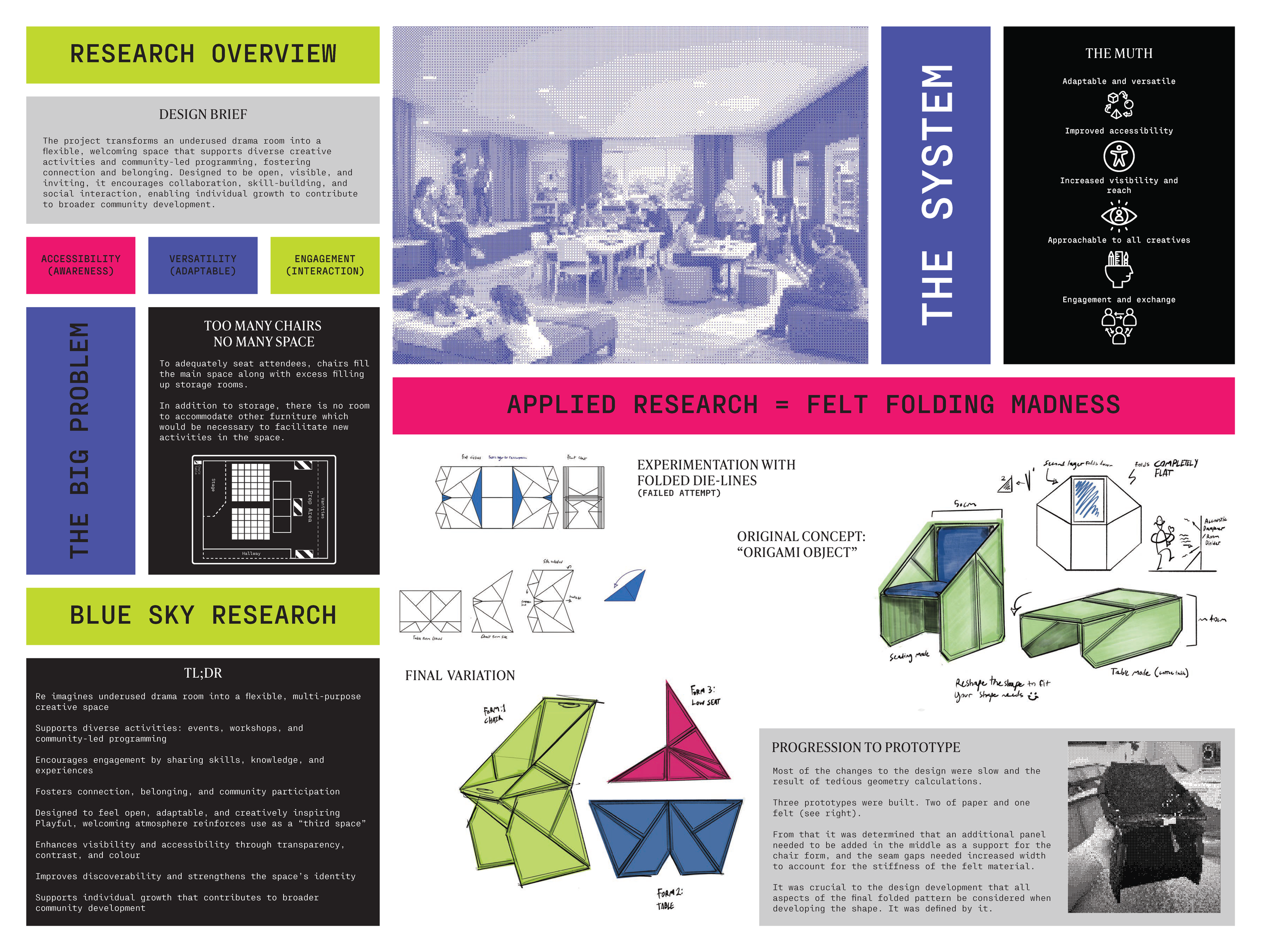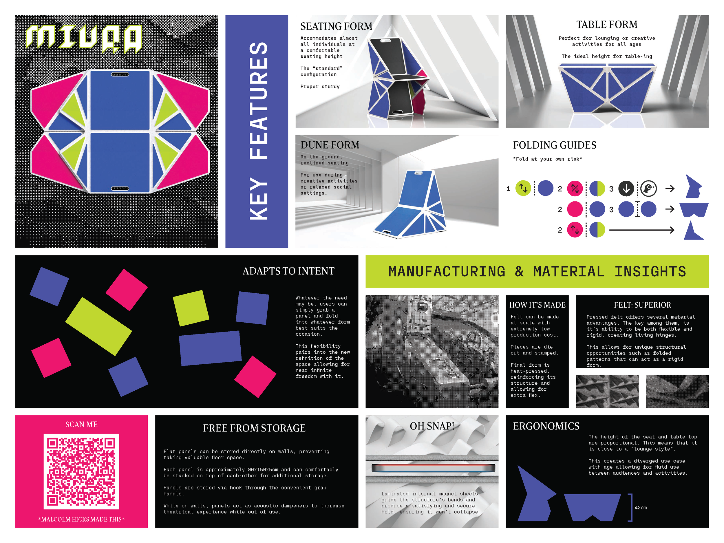 Miura Malcolm Hicks A flat, acoustically dampening panel, which folds out into both a chair and a table. Watch Video