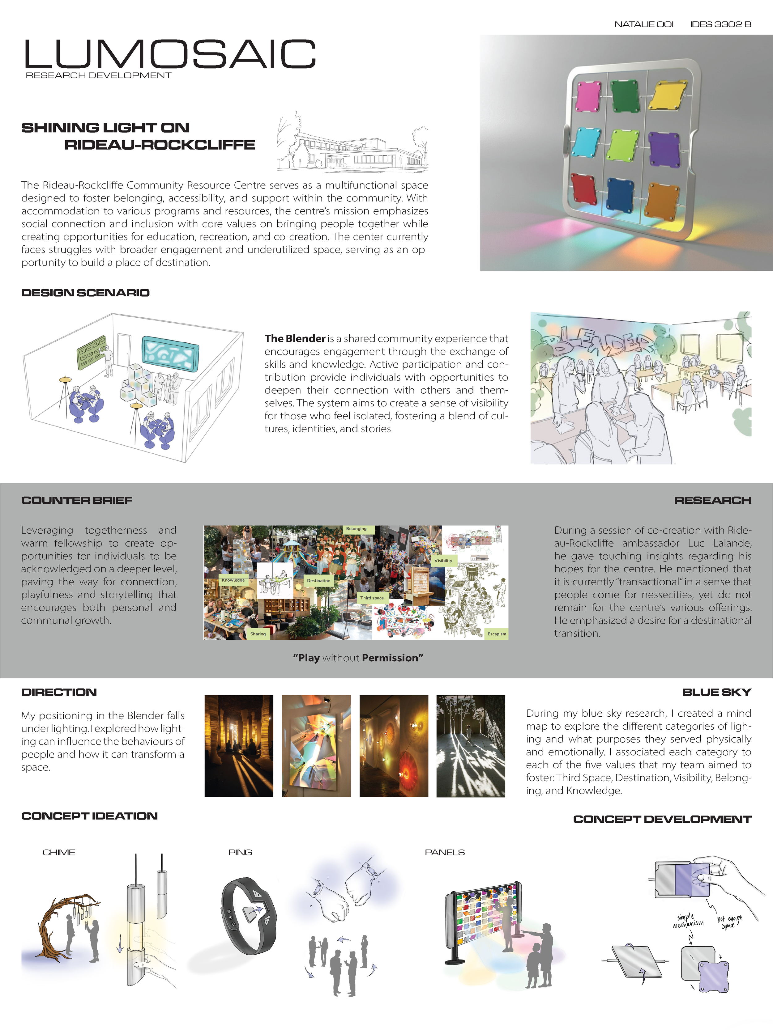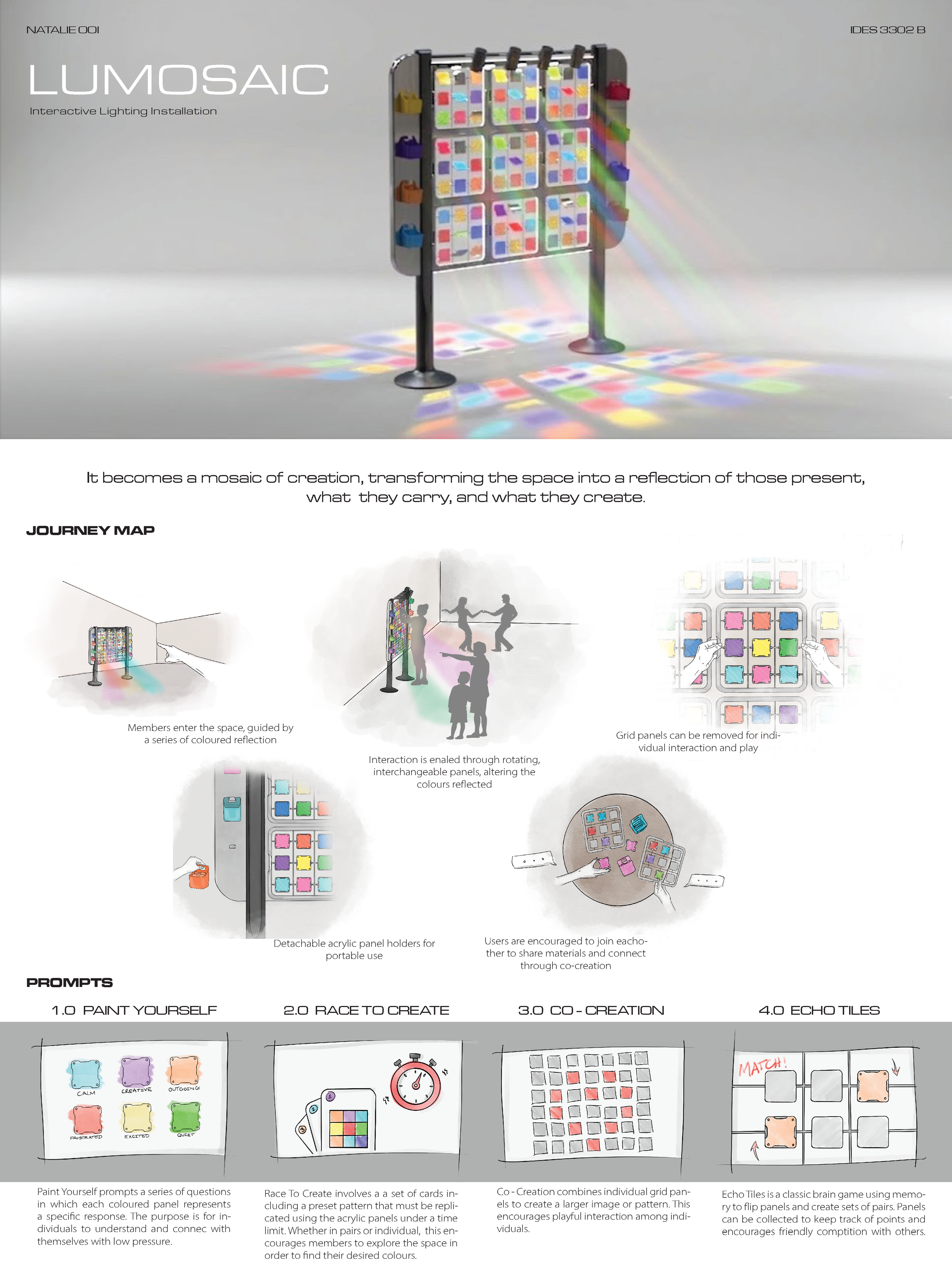 Lumosaic is an interactive lighting installation that invites play without permission. It fosters a space that reflects those present, who they are, what they carry, and what they create.