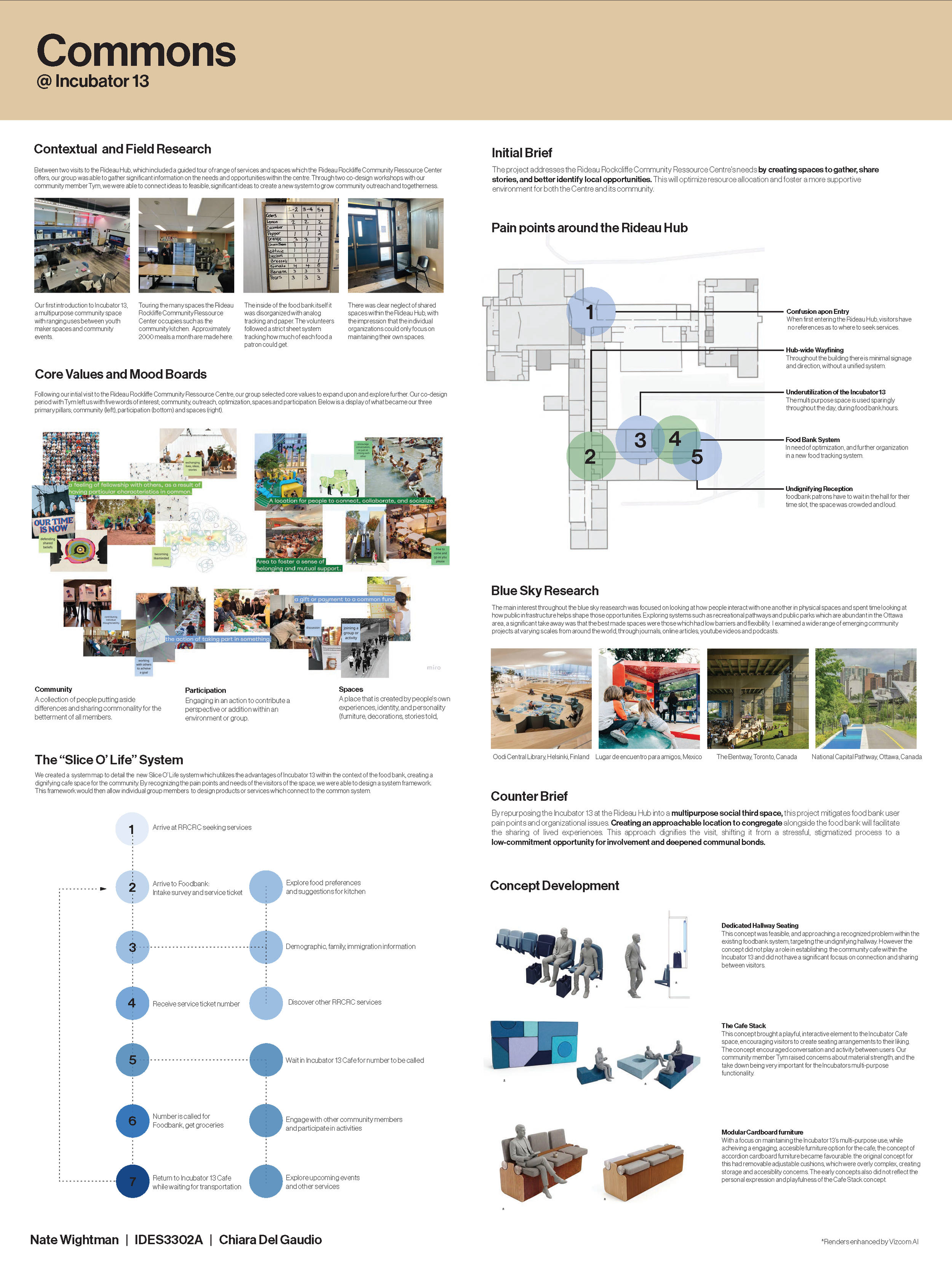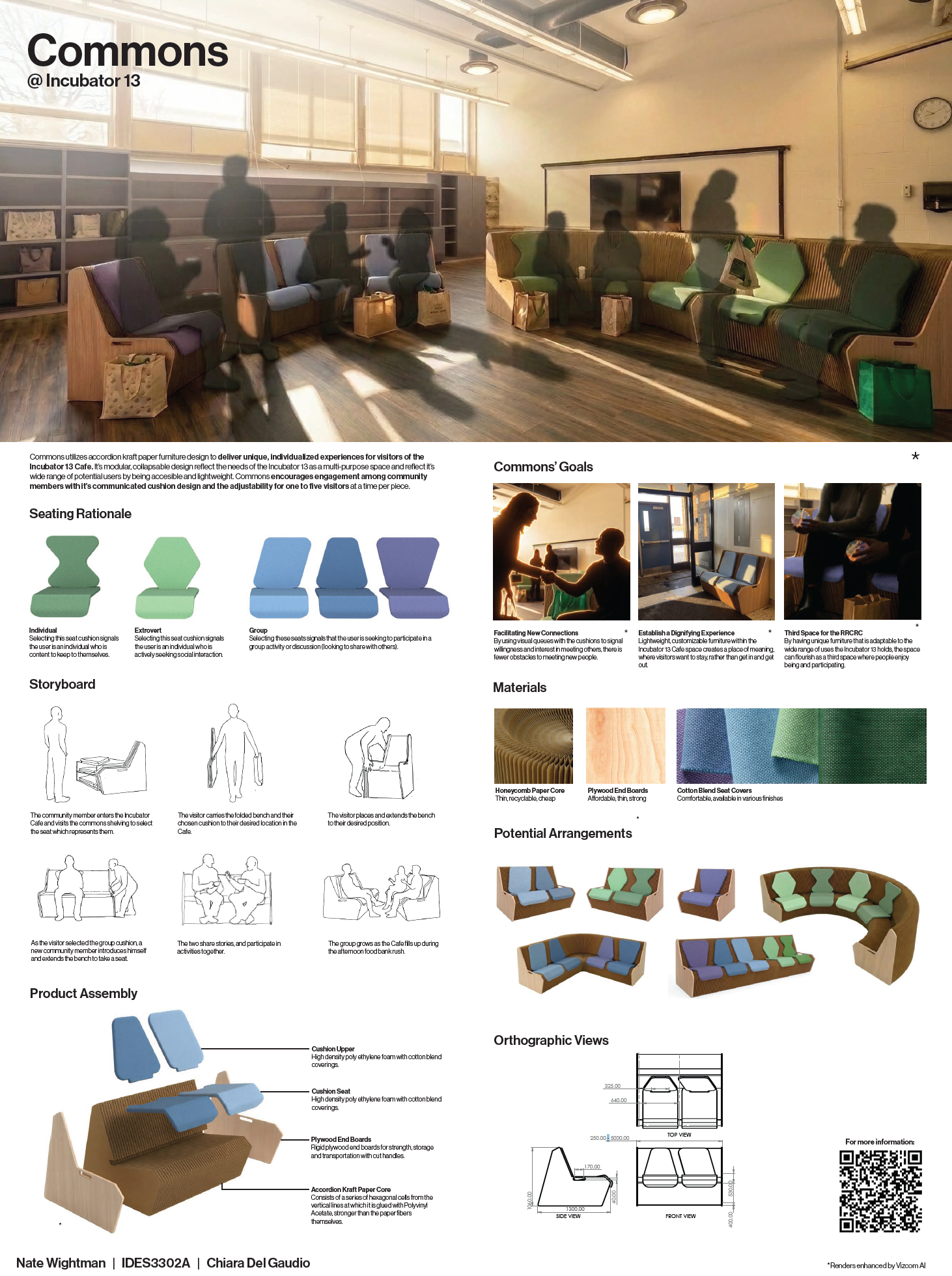 Commons utilizes accordion kraft paper furniture design to deliver unique experiences for visitors of the RRCRC. Its modular, collapsible design reflect the needs of the Incubator 13 as a multi-purpose space and cause engagement through its communicated cushion design.