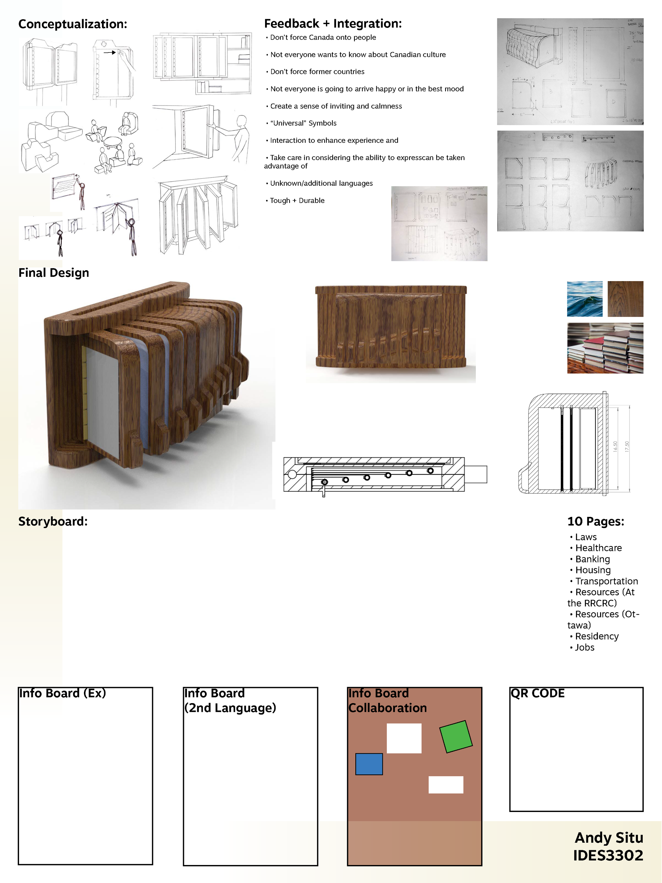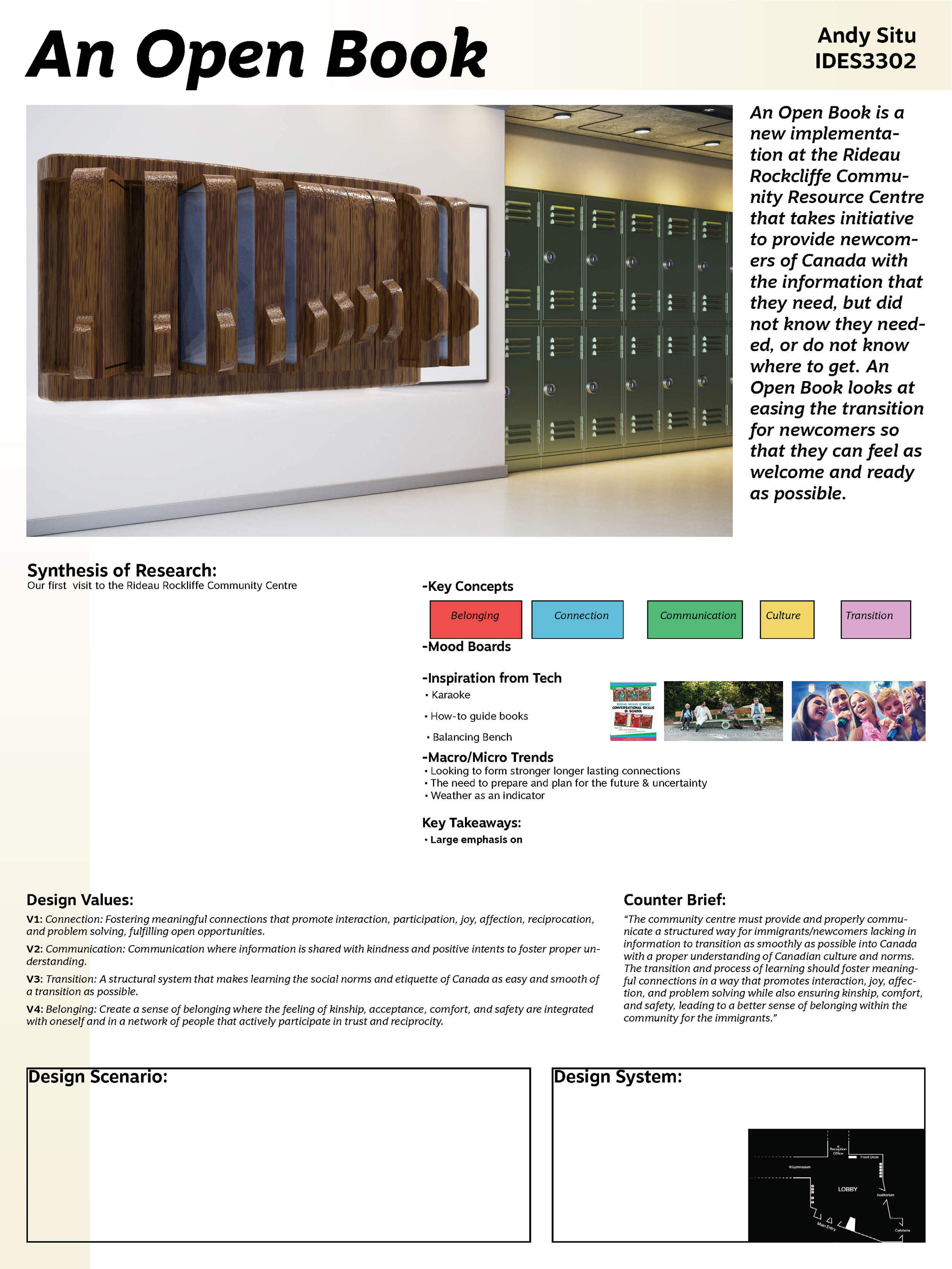 An Open Book is a wall mounted book that helps ease the transition into Canadian culture/life for immigrants by providing important information in different languages while providing opportunities to share between immigrants and locals.