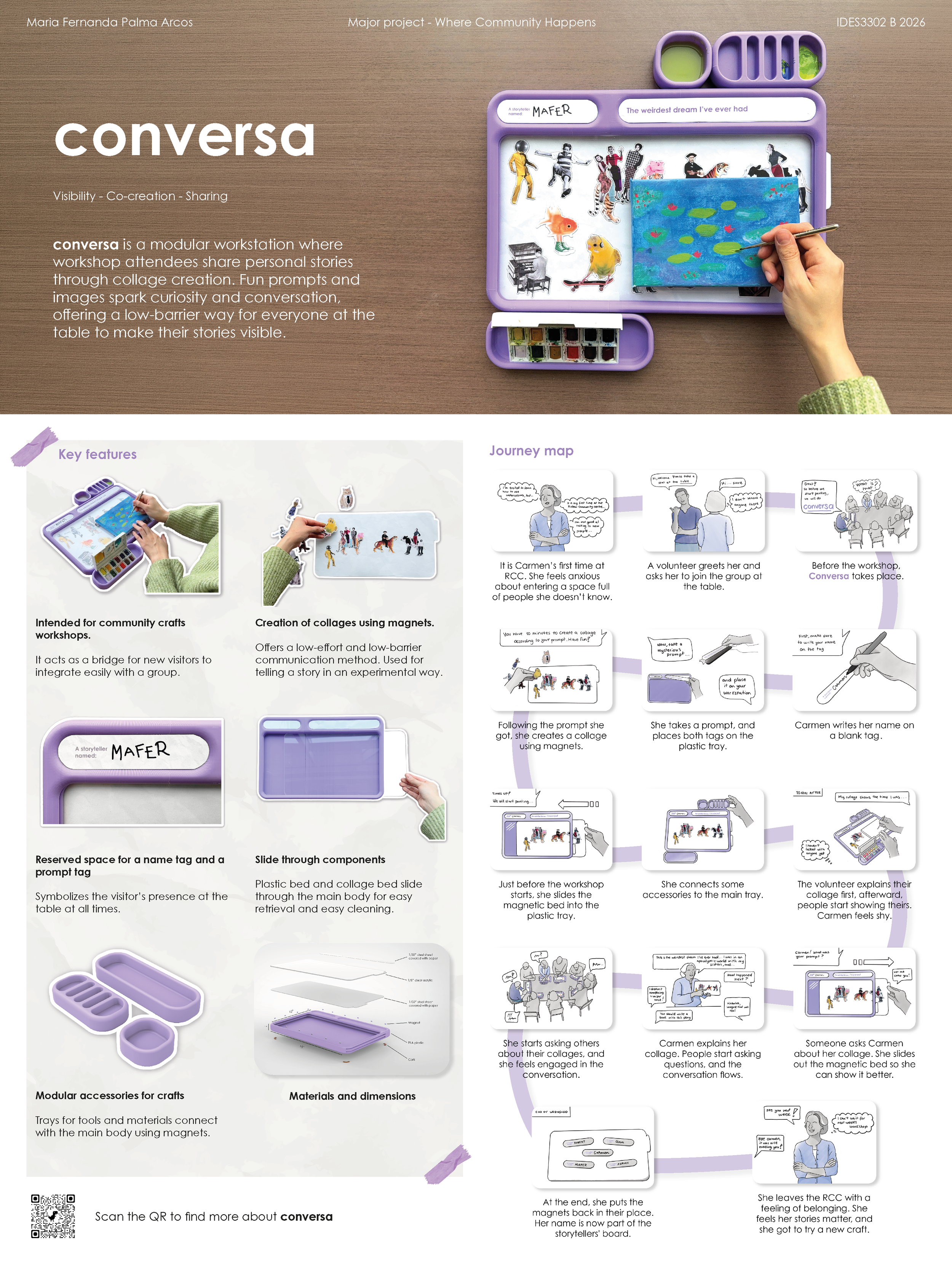 A modular workstation where workshop attendees share personal stories through collage creation. Fun prompts and images spark curiosity and conversation, offering a low-barrier way for everyone at the table to make their stories visible.